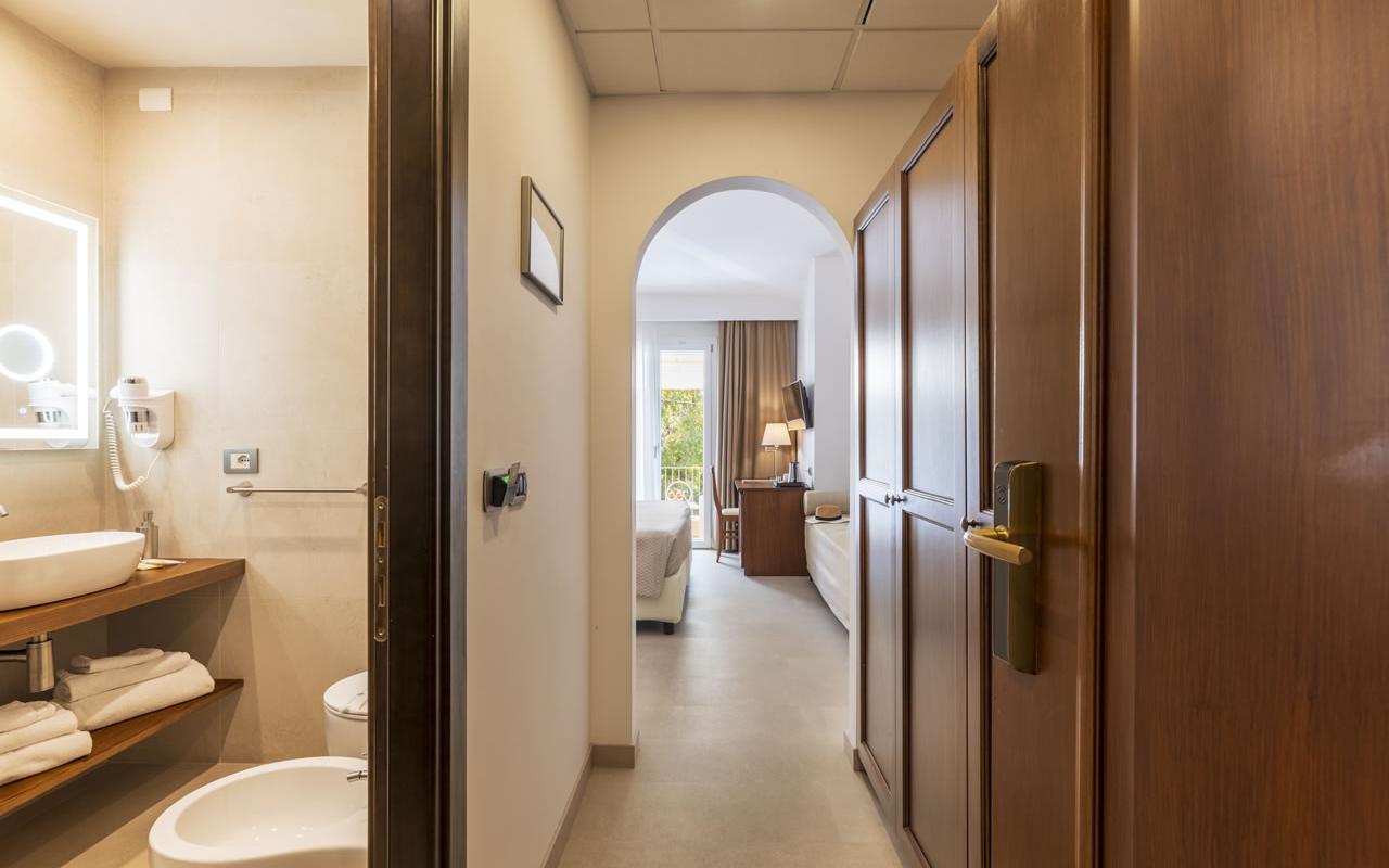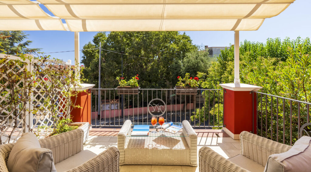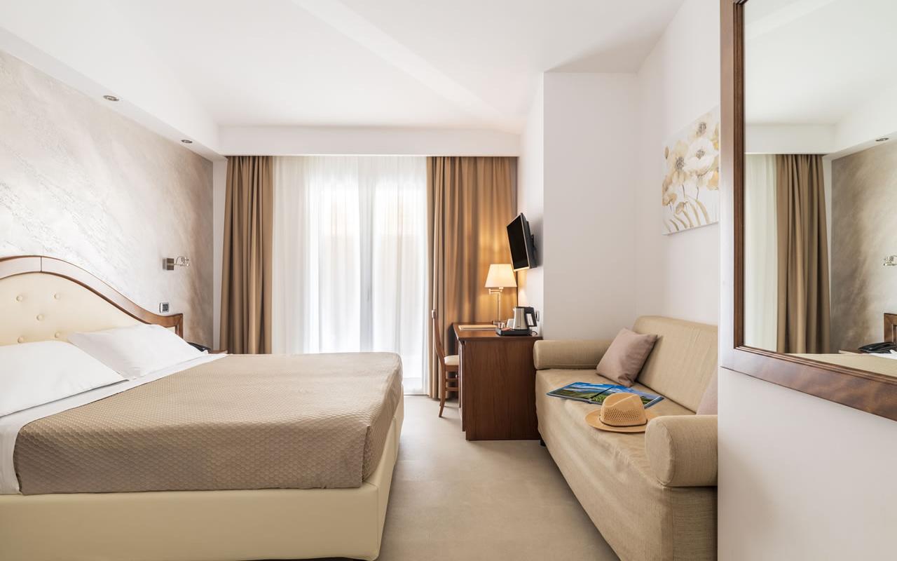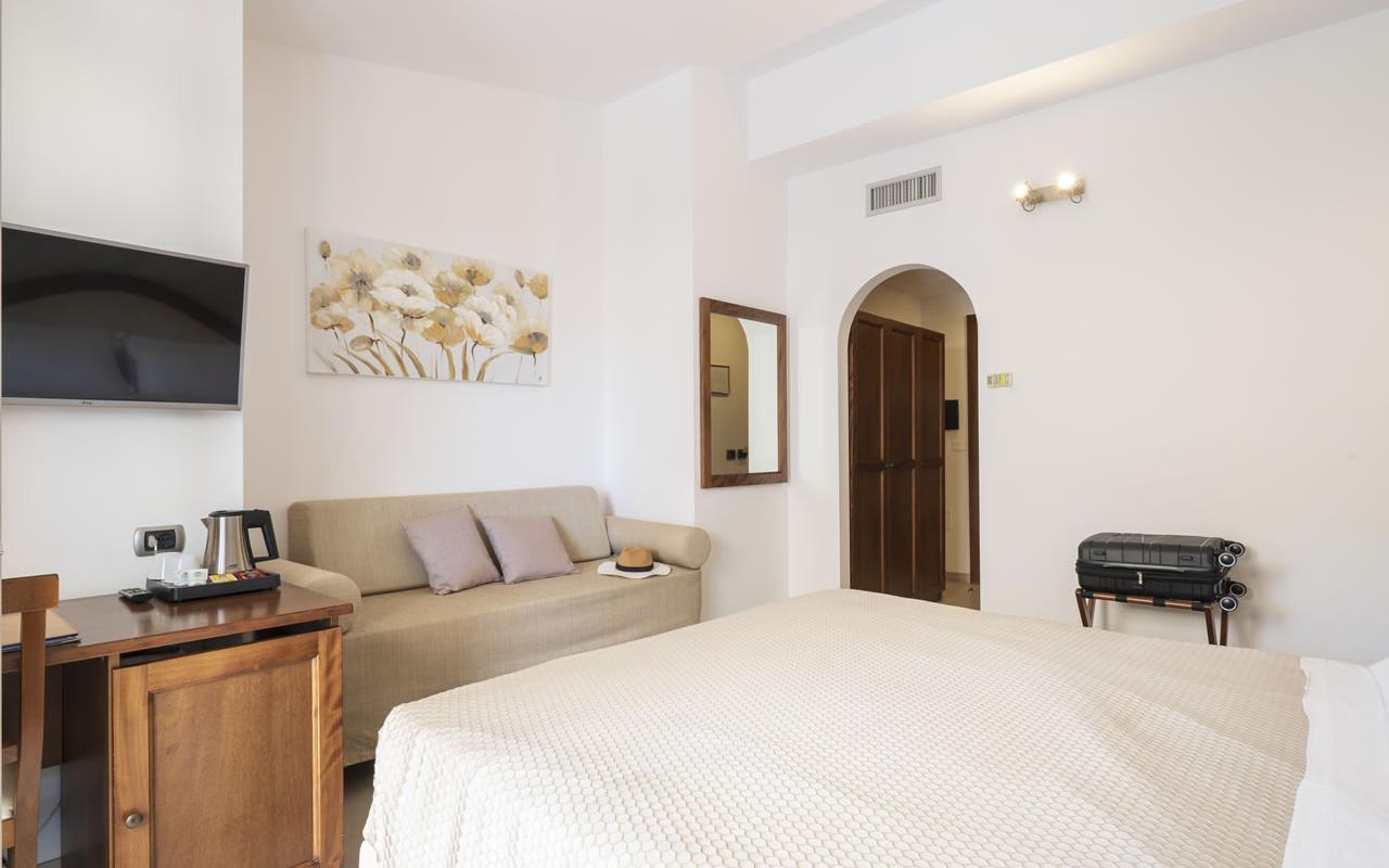 Amplia cama matrimonial y una cómoda cama para una tercera persona, un práctico mirador amueblado... ¡así te sentirás aún más cómodo! La Habitación Triple con terraza será la solución ideal para tu estancia en Santa Maria Navarrese.
